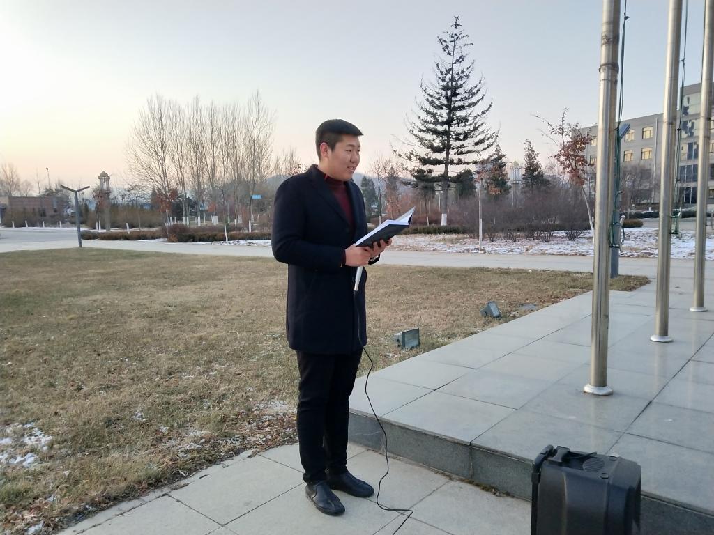 在主持人宣布升旗仪式正式开始后,英姿飒爽的国旗手迈着整齐的步伐,护送着鲜艳的五星红旗缓缓走向升旗台。礼毕结束,由曙光BG174班班长李佳兴同学代表全体同学进行国旗下演讲——《与中国梦一起翱翔》,他在演讲中提到:“少年智则国智,少年强则国强!”作为大学生的我们是未来国家的建设者。在追梦的道路上,首先应该树立吻合中国梦的目标,然后向着目标砥砺前行。我们要心怀梦想,让青春在红旗下尽情燃烧,让心在梦想的天空下自由翱翔,学会梦想滋养我们的思想与人格,用梦想激荡我们的灵魂与心智。