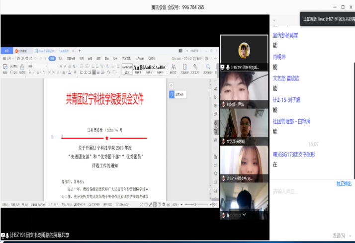 潘老师首先通报了校团委及学院分团委近期的相关工作部署,为团干部们详细解读了《关于开展辽宁科技学院2019年度“五四青年奖杯”和“五四青年奖状”评选工作的通知》、《关于开展辽宁科技学院2019年度“先进团支部”和“优秀团干部”“ 优秀团员”评选工作的通知》两个文件,要求团干部们要提高站位,强化思想认识,着重申报材料的规范化、完整化,提高学生干部的责任意识和为广大青年团员的服务意识,充分发挥团学骨干的模范带头作用。 号召团干部们充分利用微信公众平台、二级网站、青年大学习等线上资源与时俱进地吸取思想政治理念,加强思想政治建设,结合网络平台深入学习抗疫先进事迹,向抗疫英雄学习,传递正能量。